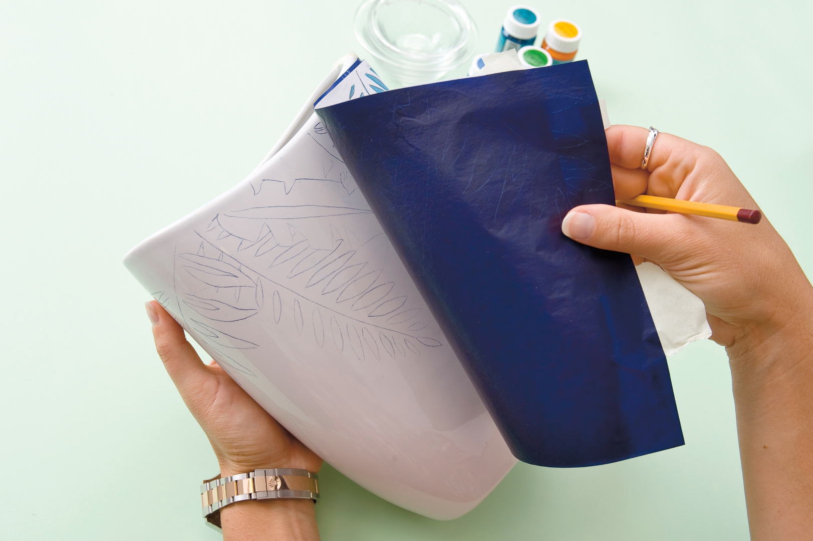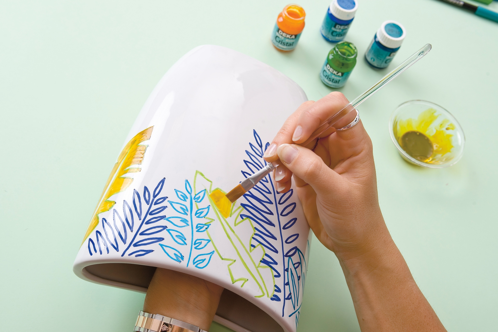 Babos Timit nem sikerült zavarba hoznunk, pedig nem kis feladat elé állítottuk A Praktika műhelyében. A teniszező az ecsetet legalább olyan jól forgatja a kezében, mint az ütőt. Bravúrosan ügyes és pontos mozdulatokkal festette meg a színes mintát a fehér vázára.