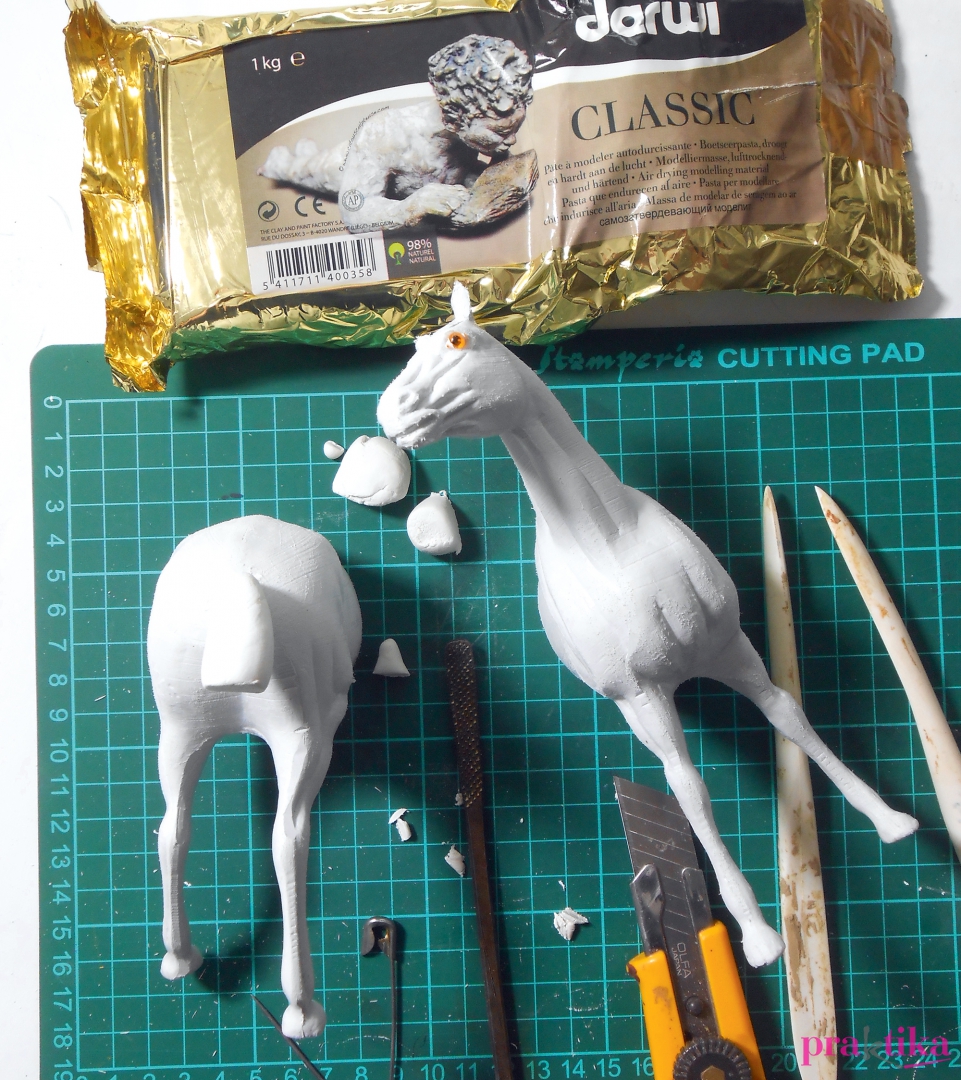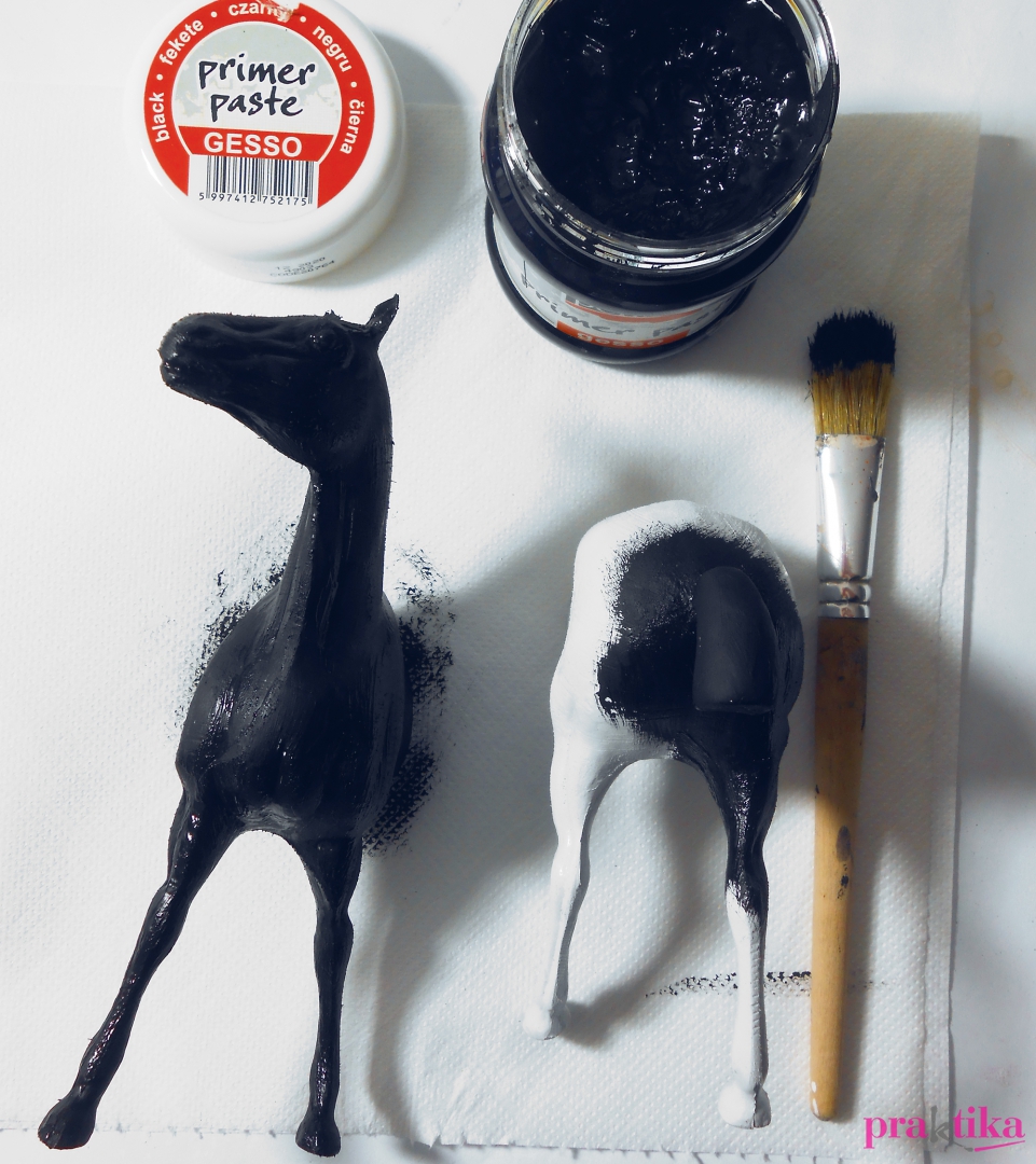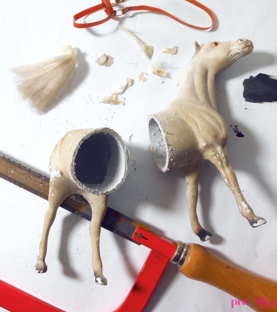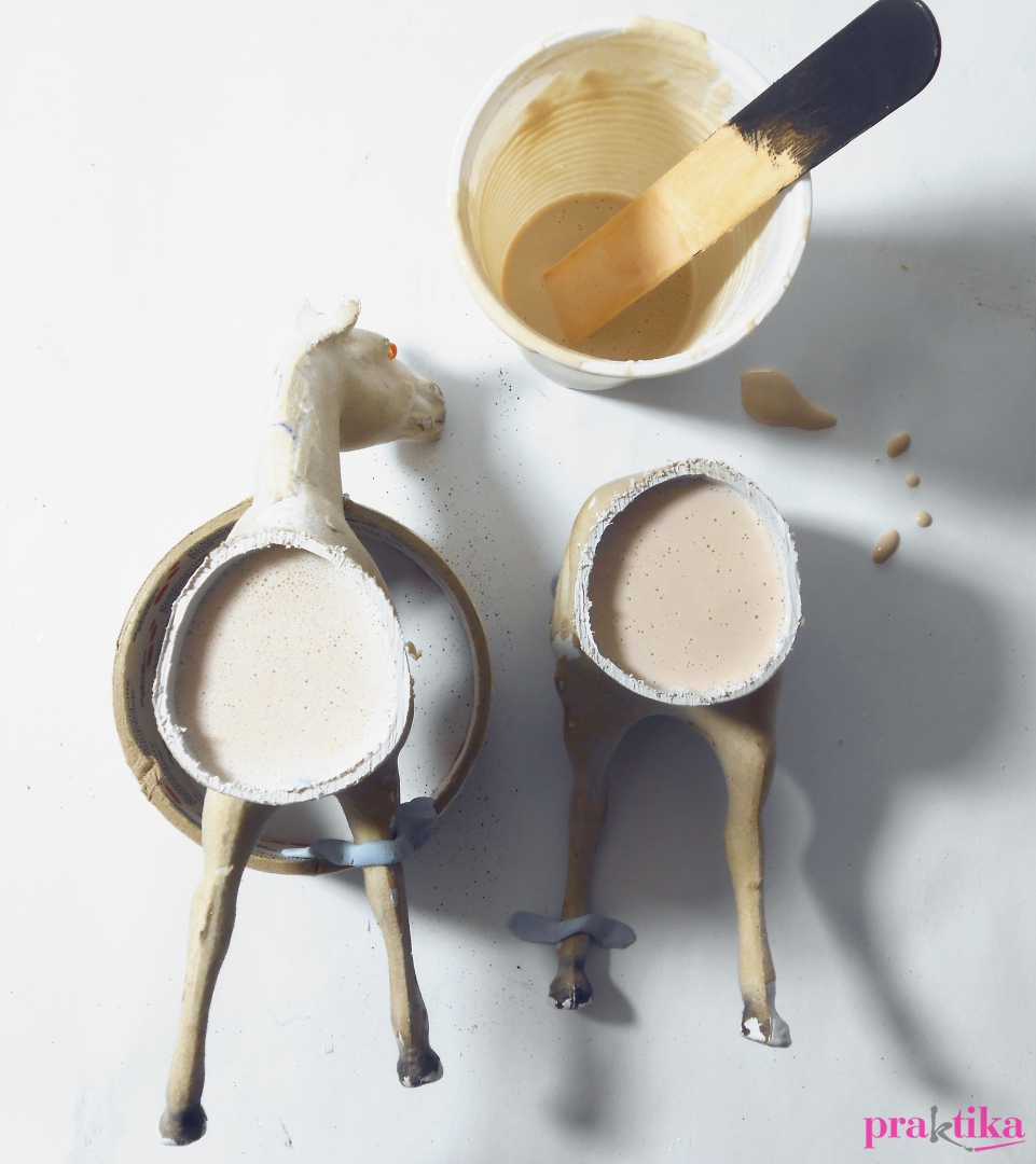 A modellgipszet hagyd teljesen megkötni, és csak utána folytasd a munkát. Ha a te lovadnak is szőrből van a farka, azt távolítsd el és levegőre száradó gyurmából formázz neki újat és ragaszd fel hobbiragasztóval. A mágnes alá ragassz filckorongot, majd arra a mágnest.