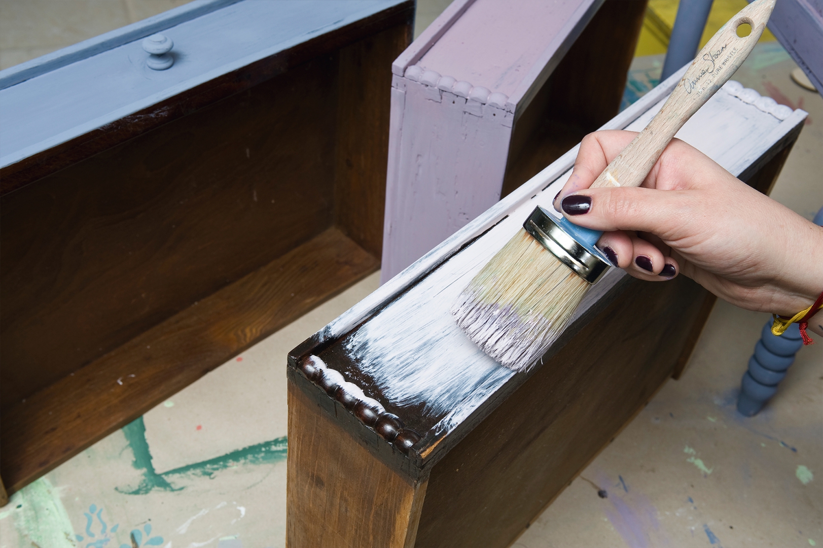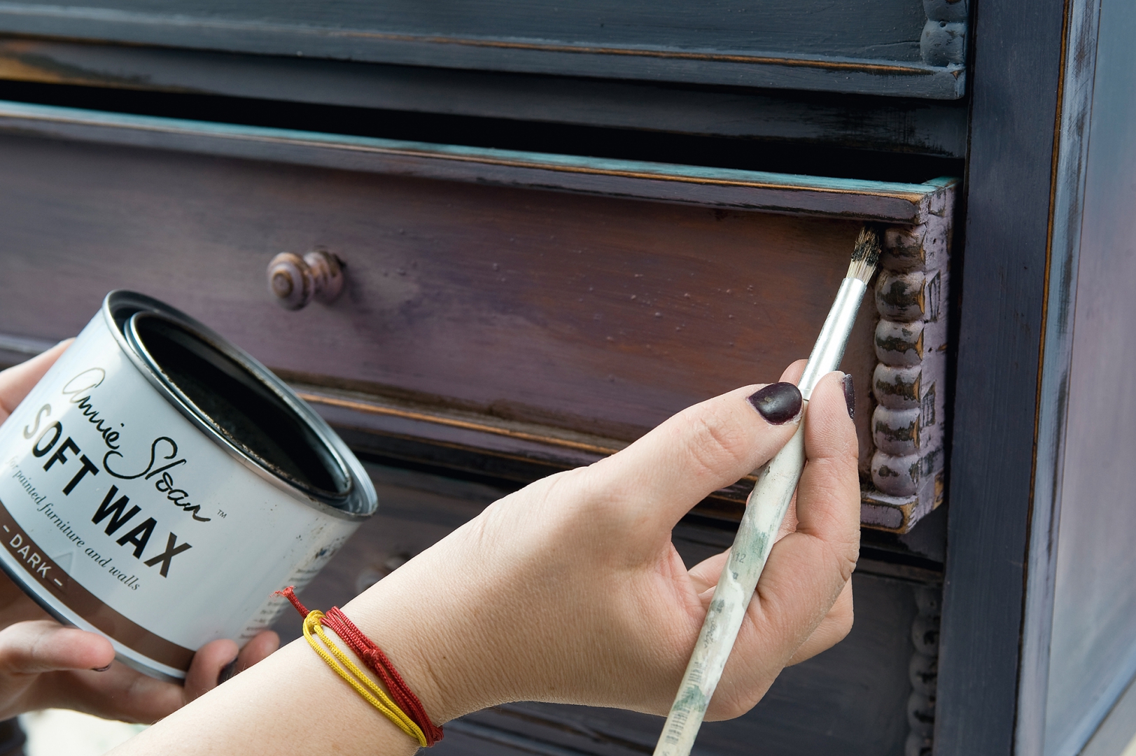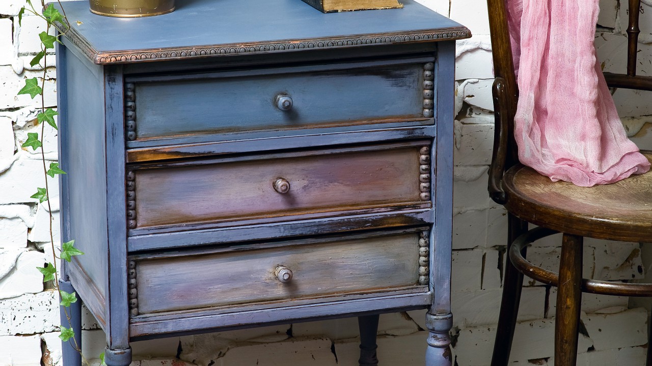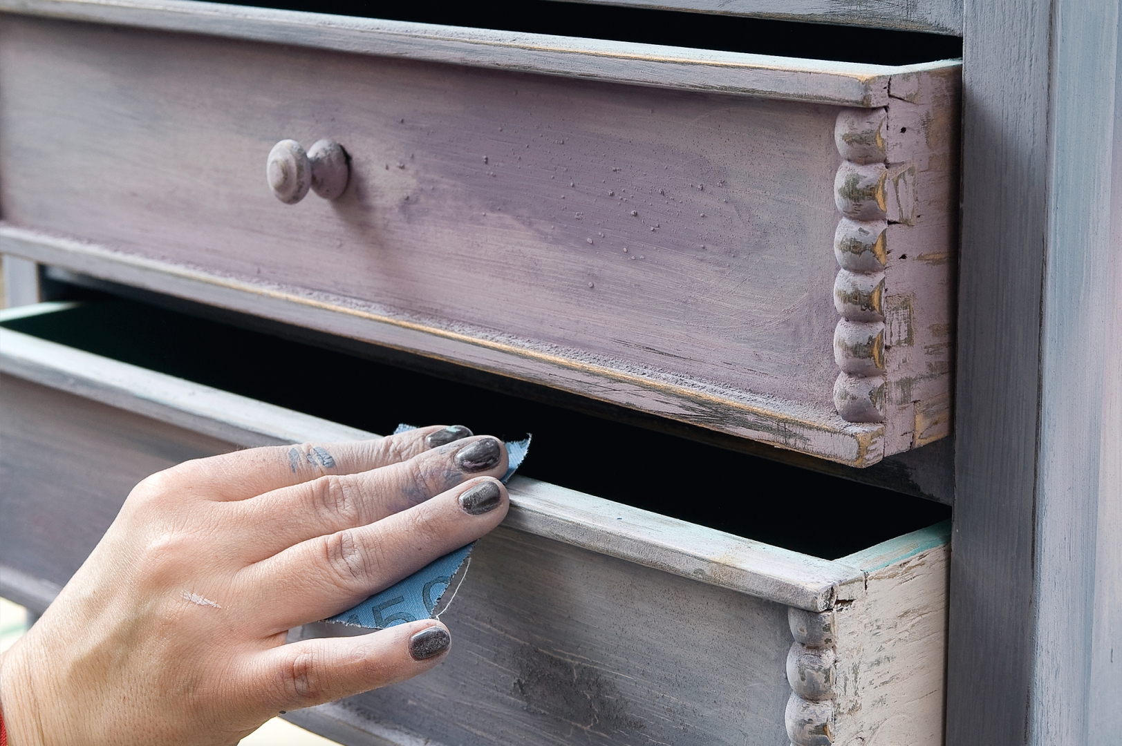 Úgy dolgozd össze a színeket, hogy ne legyenek élesek az átmenetek. A fiókokat is kend le a három különböző árnyalattal, belsejüket pedig a másik választott színnel. Várd meg, amíg teljesen megszárad a festék, majd csiszolópapírral menj végig az éleken és helyenként a nagyobb felületeken is, hogy kopott hatást érj el. Színtelen waxszal alaposan kend át az egész felületet, még a fiókok belsejét is, mert ezzel fixálod a festéket. A sarkokat árnyékold sötét színű waxszal, puha ronggyal töröld vissza a felesleget, hogy füstöt hatású legyen az árnyékolás.