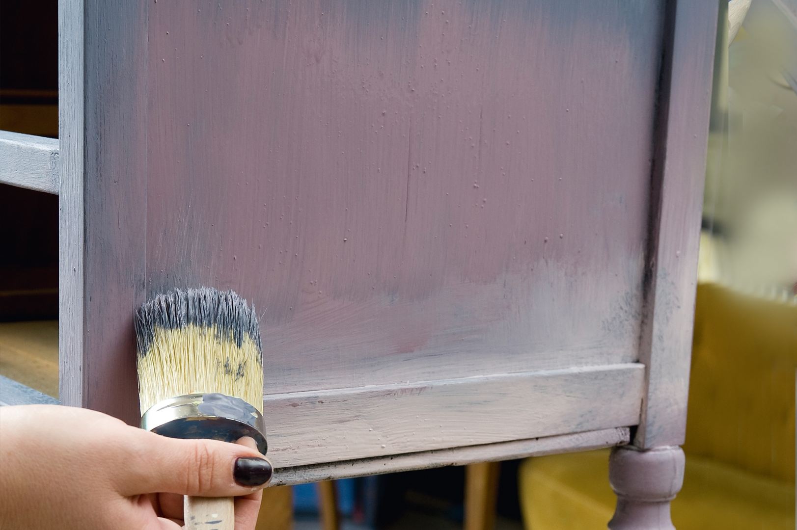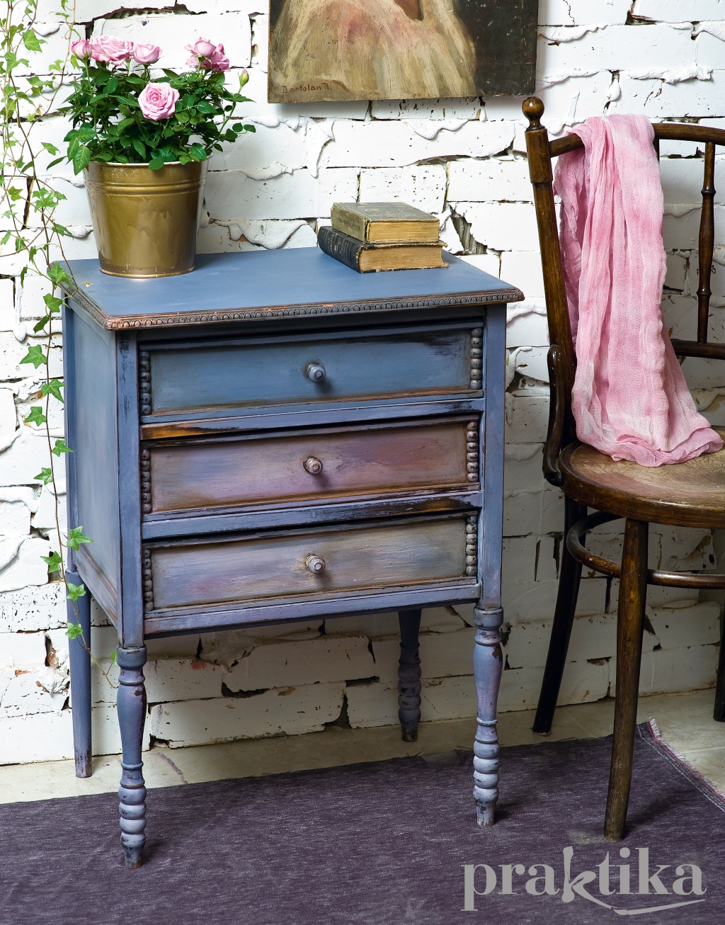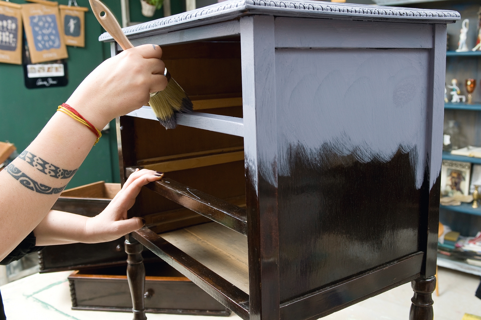 Úgy dolgozd össze a színeket, hogy ne legyenek élesek az átmenetek. A fiókokat is kend le a három különböző árnyalattal, belsejüket pedig a másik választott színnel. Várd meg, amíg teljesen megszárad a festék, majd csiszolópapírral menj végig az éleken és helyenként a nagyobb felületeken is, hogy kopott hatást érj el. Színtelen waxszal alaposan kend át az egész felületet, még a fiókok belsejét is, mert ezzel fixálod a festéket. A sarkokat árnyékold sötét színű waxszal, puha ronggyal töröld vissza a felesleget, hogy füstöt hatású legyen az árnyékolás.