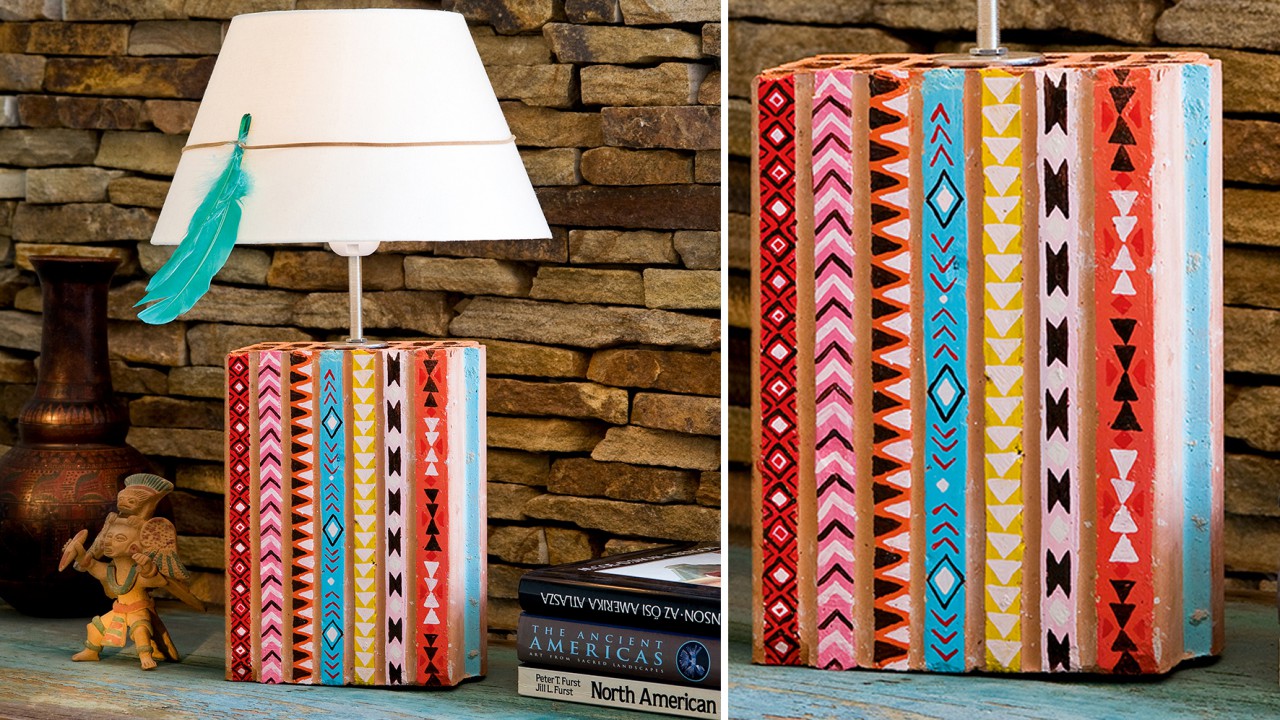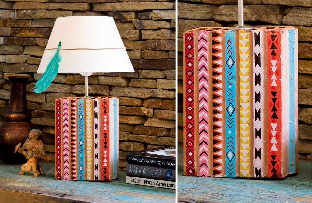 Tisztítsd meg a téglát. A vájatok közötti sávokat fesd le különböző színűre. Ezekre fess egyszerű ák-, rombusz-, háromszögmintákat, vonalkákat. A tégla hátoldalán, az alján alakíts ki ráspollyal egy félköríves bemélyedést, ahol kivezetheted a vezetéket. Használj védőszemüveget.