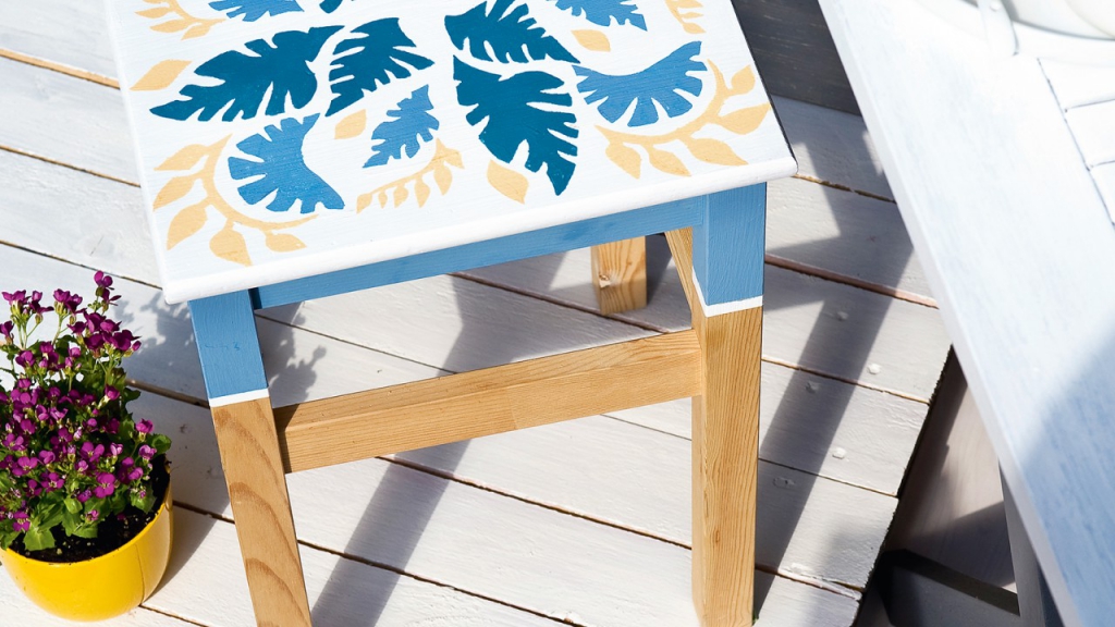 A természetet is becsempészhetjük az otthonunkba – akár egy felújított ülőke révén is. Alapozzuk le az ülőlapot, majd ha megszáradt, egy előre elkészített, fóliából kivágott minta segítségével fessünk leveleket, indákat rá. Bármely színt választhatjuk, a fehéren jól mutat a kék vagy akár a zöld is.
