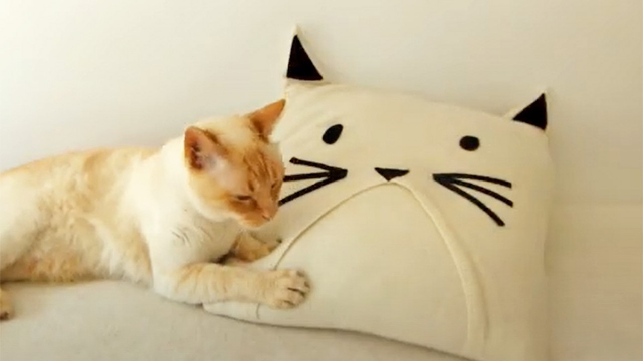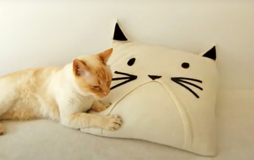 Első lépésben vágd szét darabokra a V-nyakú pólót, majd az egyik ujjat illeszd a nyakrészhez gombostűvel, a videón látható módon. Varrd össze géppel, majd vágd le az ujj felesleges részét. Ezután folytasd a párnahuzat két oldalával, tedd egymásra őket, majd ha összevarrtad a három szélét, fordítsd ki. Fekete filcből vágd ki és varrd fel az orrot, a szemeket és a bajszot. A pólód kis darabkájából varrd meg a füleket is. Végül tedd bele a párnát a huzatba.