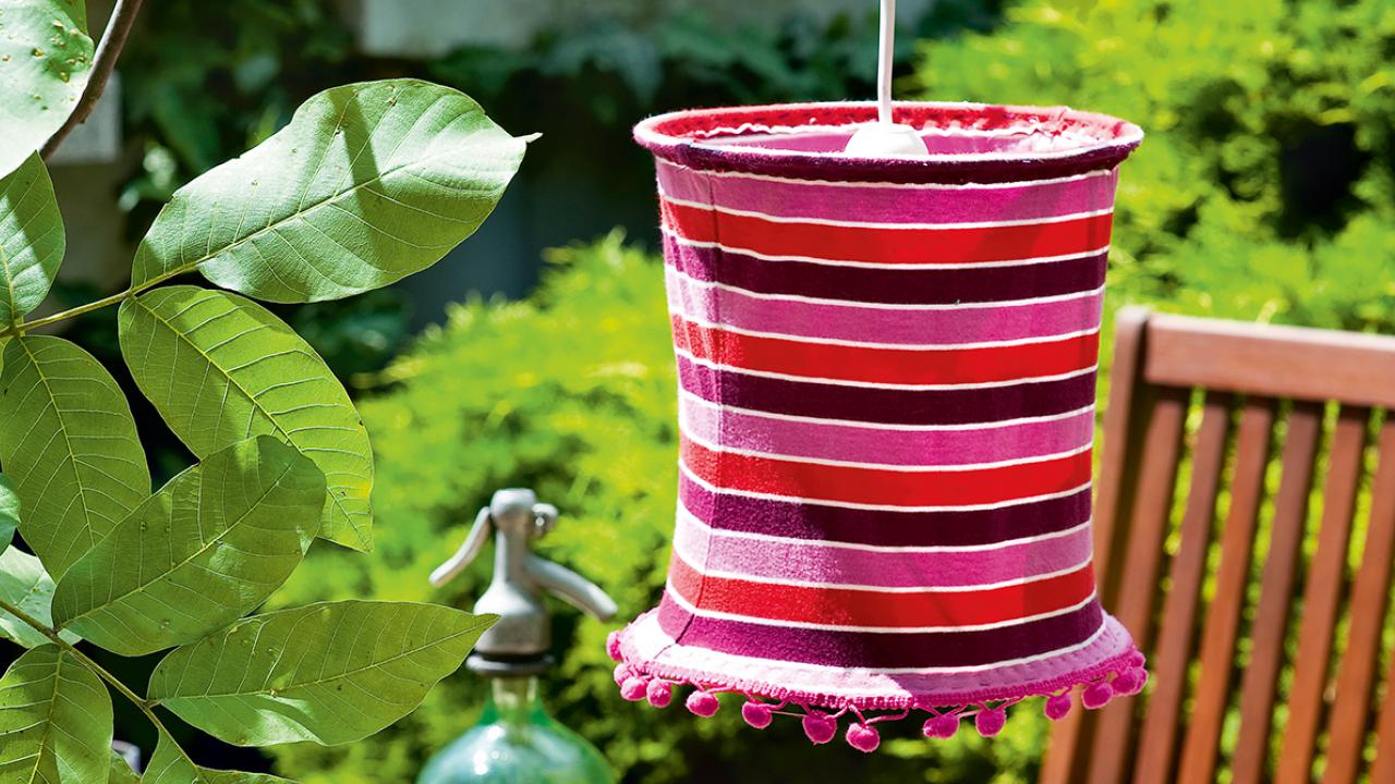 Varrj a kiszemelt pólóból egy olyan átmérőjű hengert, amit feszítve tudsz a lámpakarikádra tenni. Ettől majd a rugalmas kelme középen karcsúra húzódik. Hajtsd rá az alsó és a felső karikára az anyagszéleket körülbelül 1 cm szélesen, és varrd körbe apró fércelőöltésekkel. Válassz a póló színével azonos cérnát, így szinte nem is látszik majd a varrás. Az extra vonalú ernyő aljára még egy pomponsort is tehetsz. Világít is majd, ha szakboltban veszel foglalatot vezetékkel, amit te vagy egy hozzáértő ember szereljen fel a helyére.