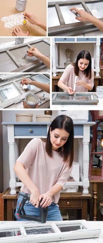 Mérd meg az ablakkereted középső kazettáját és ennek megfelelő méretű darabot vágj le a csirkehálóból. Csípőfogóval könnyedén átvághatod a vékony drótot. Fektesd háztartási csomagolóra a leszabott darabot, majd szivacsecsettel fesd le fehérre az egyik oldalról, majd száradás után a másik oldalról is a háló drótszálait. Tedd az ablakot az asztalra úgy, hogy a hátoldala nézzen felfelé, majd az üvegfelületekre kb. 20 cm távolságból permetezz tükörspray-t. Várd meg a teljes száradást, majd szivacsecsettel fesd le az üvegfelületet szürke krétafestékkel. Fordítsd át az ablakot, maszkold ki az üvegfelületeket, és fesd le törtfehérre egy rétegben a keretet. Száradás után tűzőgéppel rögzítsd a hálót a középső kazettára, majd csiszold meg az ablak éleit, hogy kopottas hatást érj el.