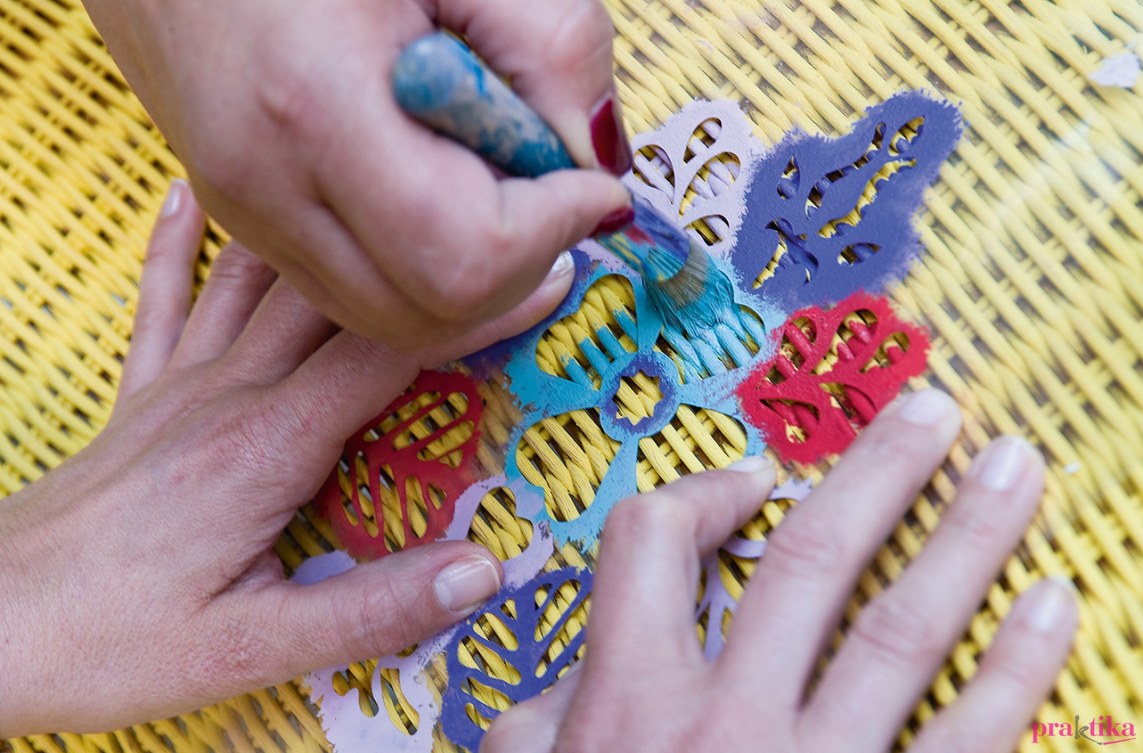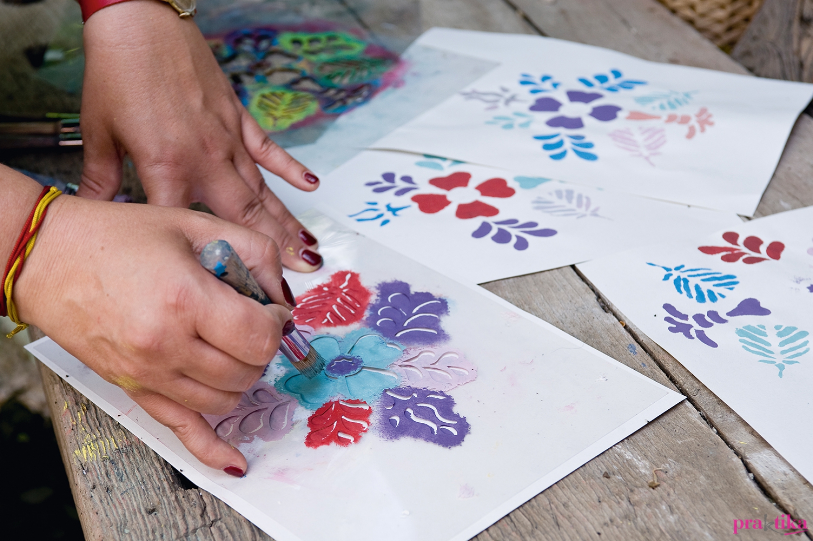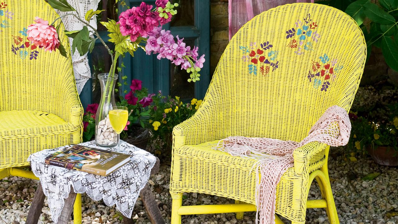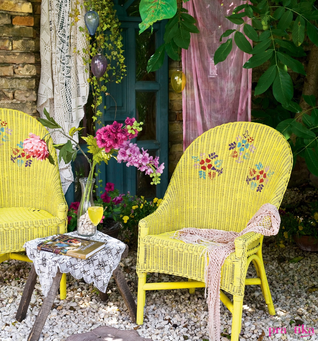 Ha megszáradt a festék, fektesd a felületre a sablont. Rövid szőrű ecsettel vagy szivaccsal ütögesd a festéket a felületre. Ha a minták is megszáradtak, akkor teríts le egy fóliát, erre állítsd a széket, majd a fújható lakkal mindenhol permetezd be a felületet. Ne akarj egyszerre sokat felvinni, inkább várd meg a száradást, és menj át rajta még egyszer, mert különben megfolyhat a lakk. A mintákat akrilfestékkel is készítheted, így nem kell megvenned több színt egyszerre a krétafestékből.