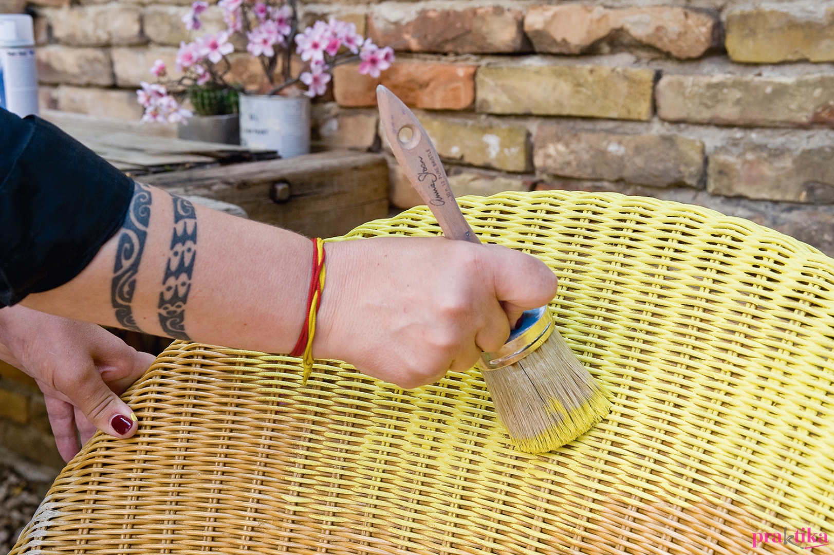 Tisztítsd meg a rattanszéket, hogy a ne legyen poros a felület. Csiszolni vagy koptatni nem kell, még akkor sem, ha le volt lakkozva, mert a krétafestékek megtapadnak a lakkozott felületen is. Nagyméretű, sűrű szálú ecsettel vidd fel az alapszínt egy rétegben. Körkörös mozdulatokkal dolgozz, de ne aggódj, ha a résekbe nem megy be teljesen a festék, mert pont ettől lesz izgalmas a felület. Ha megszáradt az első réteg, és úgy érzed, nem fed eléggé, akkor még egyszer átkenheted ugyanazzal a színnel.