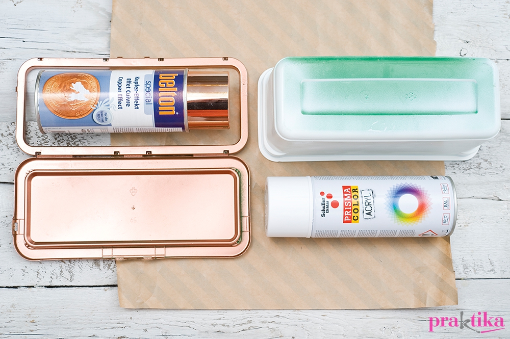 Válaszd szét a dobozt a tetőtől, a dobozt fújd fehérre, a tetőt bronzszínűre. A szabadban vagy jól szellőző helyiségben dolgozz, és tegyél alá újságpapírt vagy nejlont. A spray-t végül mindig fordítsd fejjel lefelé, és a belül lévő csőből fújd ki a festéket, hogy nem száradjon be. Az öntapadó fóliából lyukasztóval szabj pillangókat, virágokat, és rendezd őket a doboz oldalára. A köztük lévő részeket pöttyözd alkoholos filctollal kedved szerint.