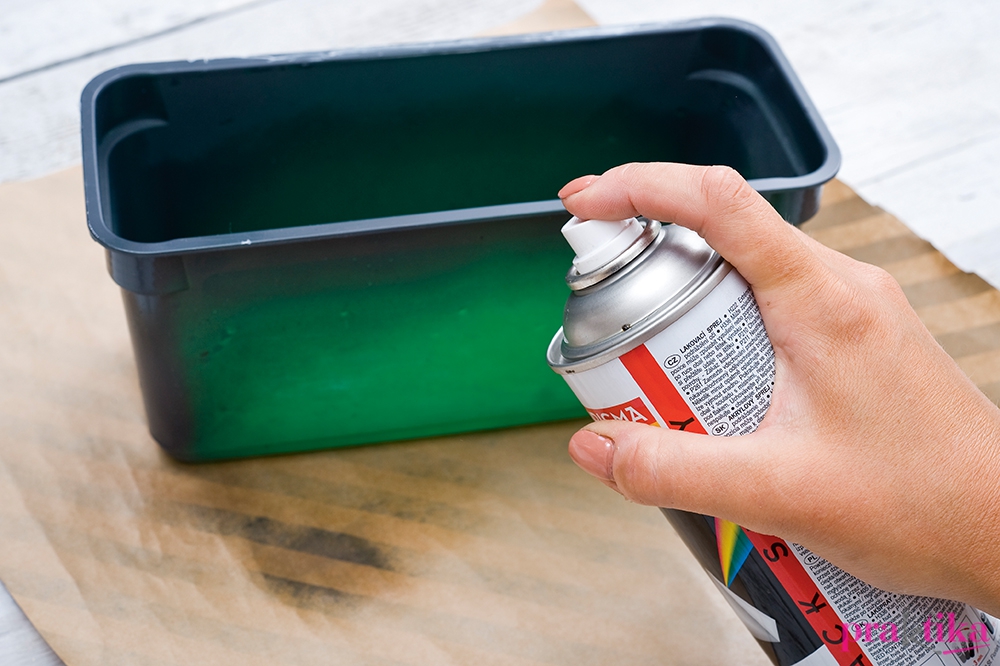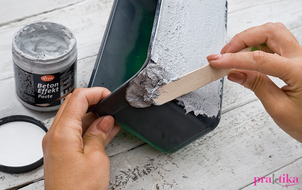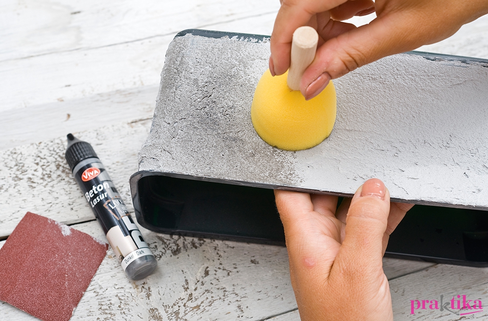 Csak a műanyag doboz aljára lesz szükséged. A doboz peremét fújd feketére, ha megszáradt, kenj az oldalára és a peremére spatulával betonpasztát, és egyengesd simára. Hagyd egy napon át száradni. Csiszold meg kicsit a felületet, majd csepegtesd rá a folyékony betont, és szivaccsal tunkold a felületbe.
