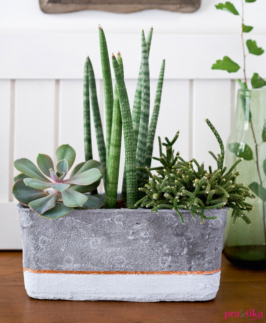 Maszkolószalaggal válaszd le a kaspó alsó részét és fesd fehérre. Távolítsd el a szalagot, és két újabbal maszkolj ki a fehér rész fölött egy vékony csíkot. Kend be füstfólia-ragasztóval, és hagyd szikkadni, amíg átlátszó nem lesz. Simítsd rá a füstfóliát, majd távolítsd el a ragasztószalagot.