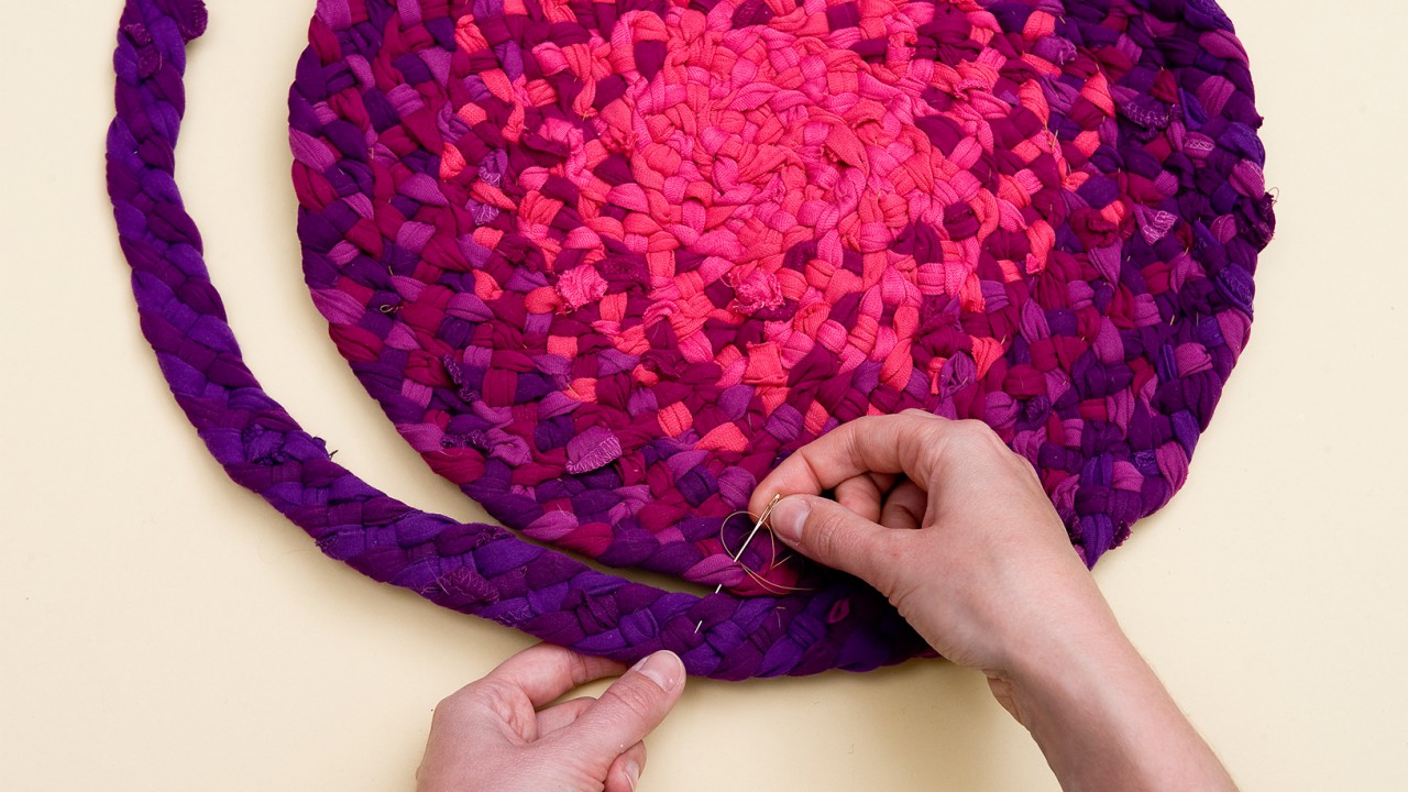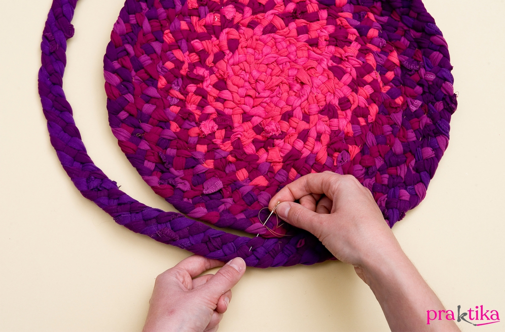 A második csíkot már úgy sződd a felvetőszálak közé, hogy szétválasztod a két szárat. Toldáskor a csíkvégeket igazítsd mindig a szőnyeg hátoldalára, amelyeket a szövés befejeztével le is öltögethetsz. Amikor már majdnem elérted a karikát, bontsd ki, illetve vág le a felvetőszálakat, és csomózd össze a párokat. A rojtokat vágd egyformára. Ha a szőnyeg közepe kipúposodna, finoman húzgálva, a köröket kifelé tolva próbáld ellapítani. A pólófonalból horgolással is lehet szőnyeget készíteni vagy ugyanezzel a módszerrel készíthetsz szuper tárolókat is.